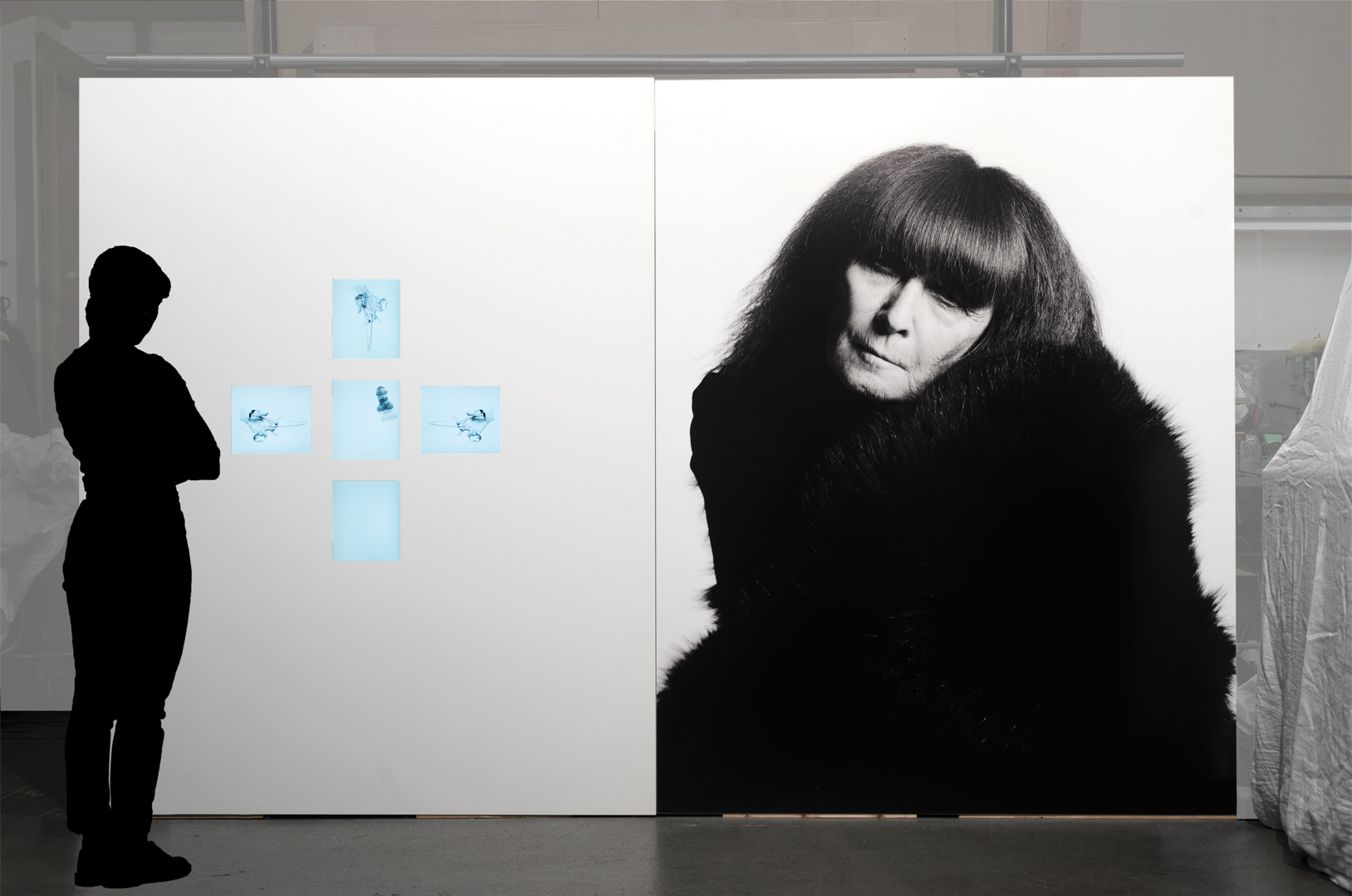 « Fasciné par le charisme de Sonia Rykiel je décide de réaliser un portrait en plan taille d’elle et une de ses créations - un sex-toy rose surmonté d’une plume - présentés en diptyque.